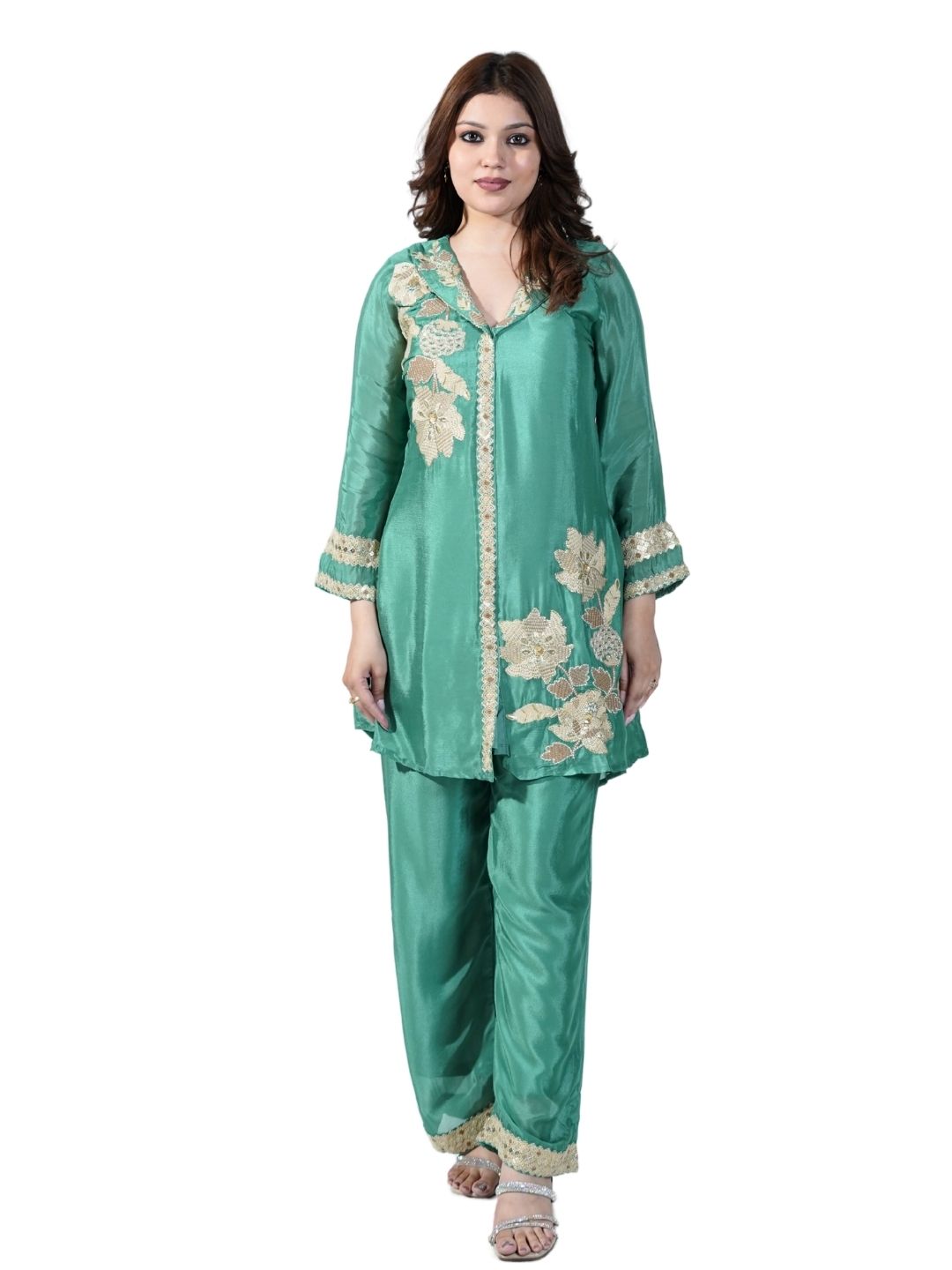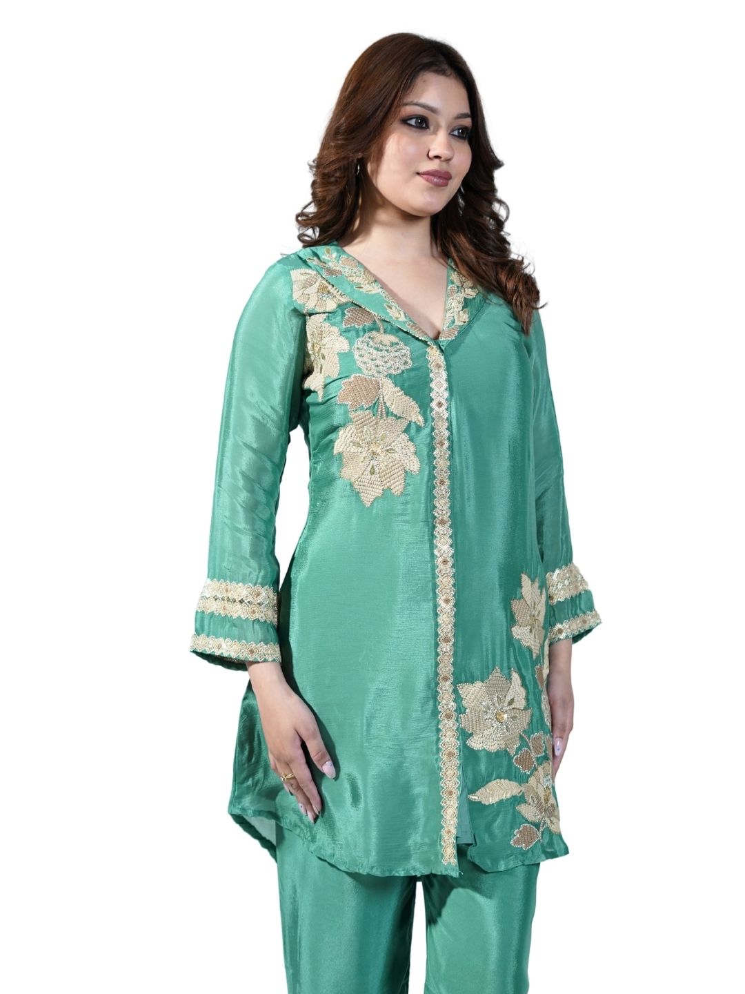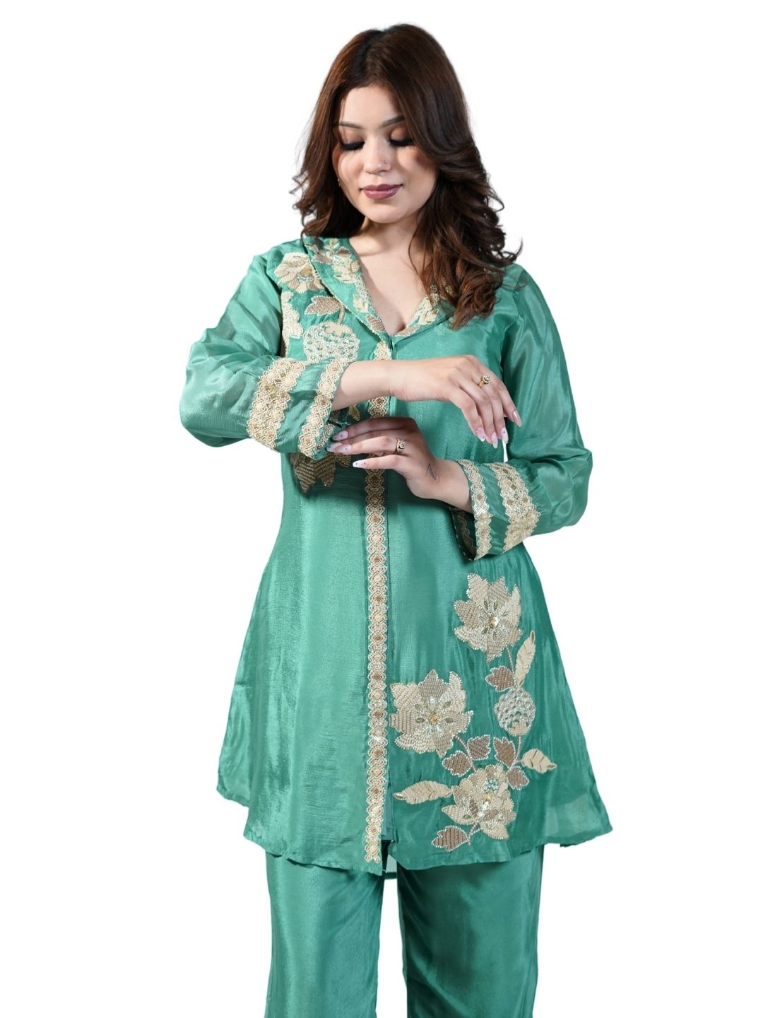 Intricate chini work highlighted with fine thread embroidery Coordinated kurta and pant set for effortless styling Soft, breathable fabric ideal... Read more