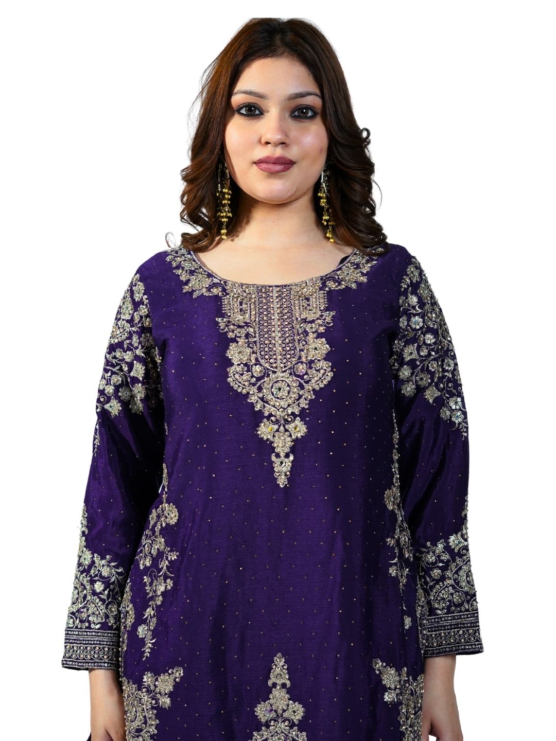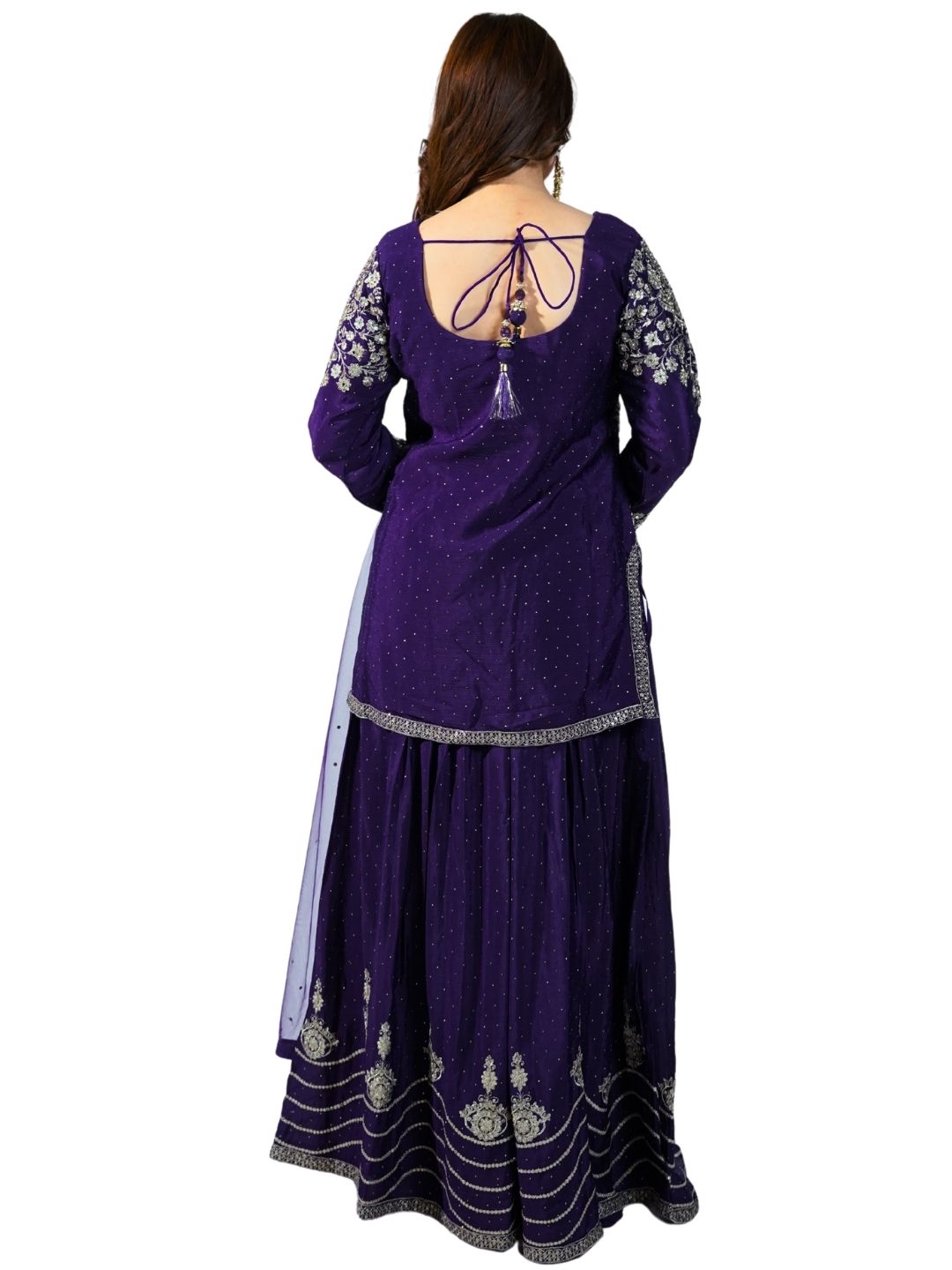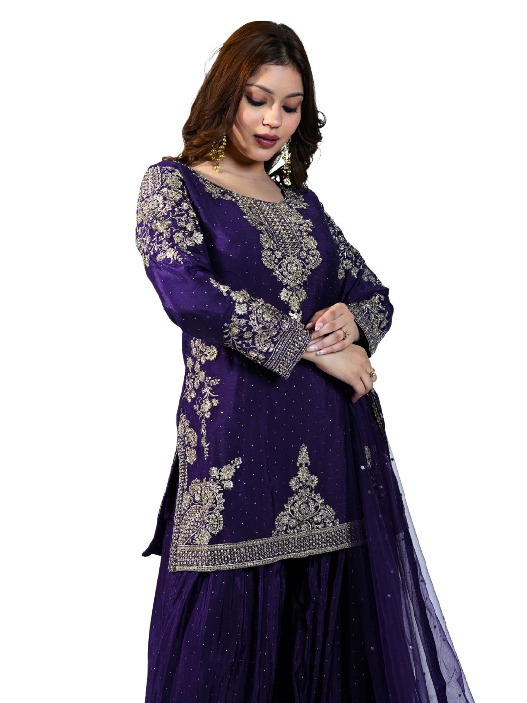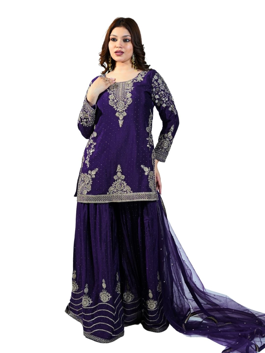 Premium Chinon fabric for a rich, flowy drape Intricately hand-done Arii embroidery for a refined, traditional touch Stylish sharara silhouette... Read more