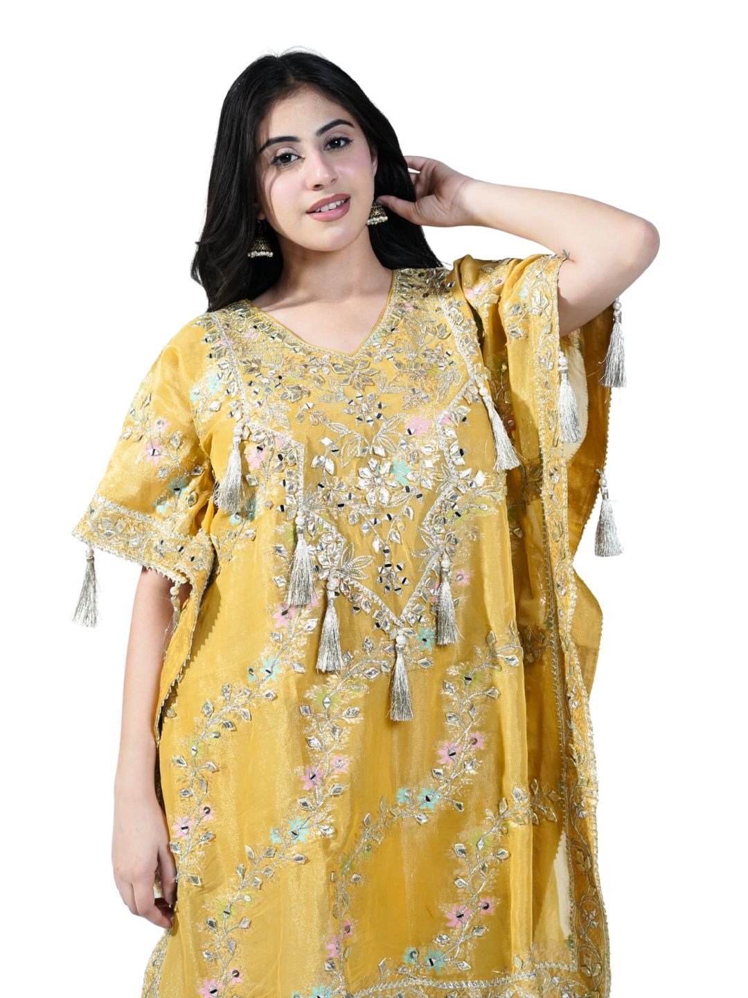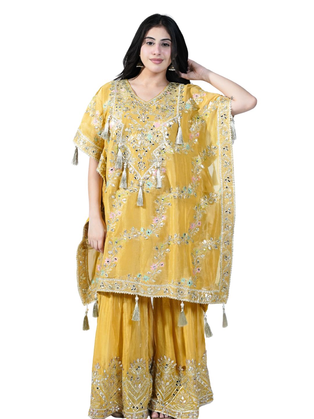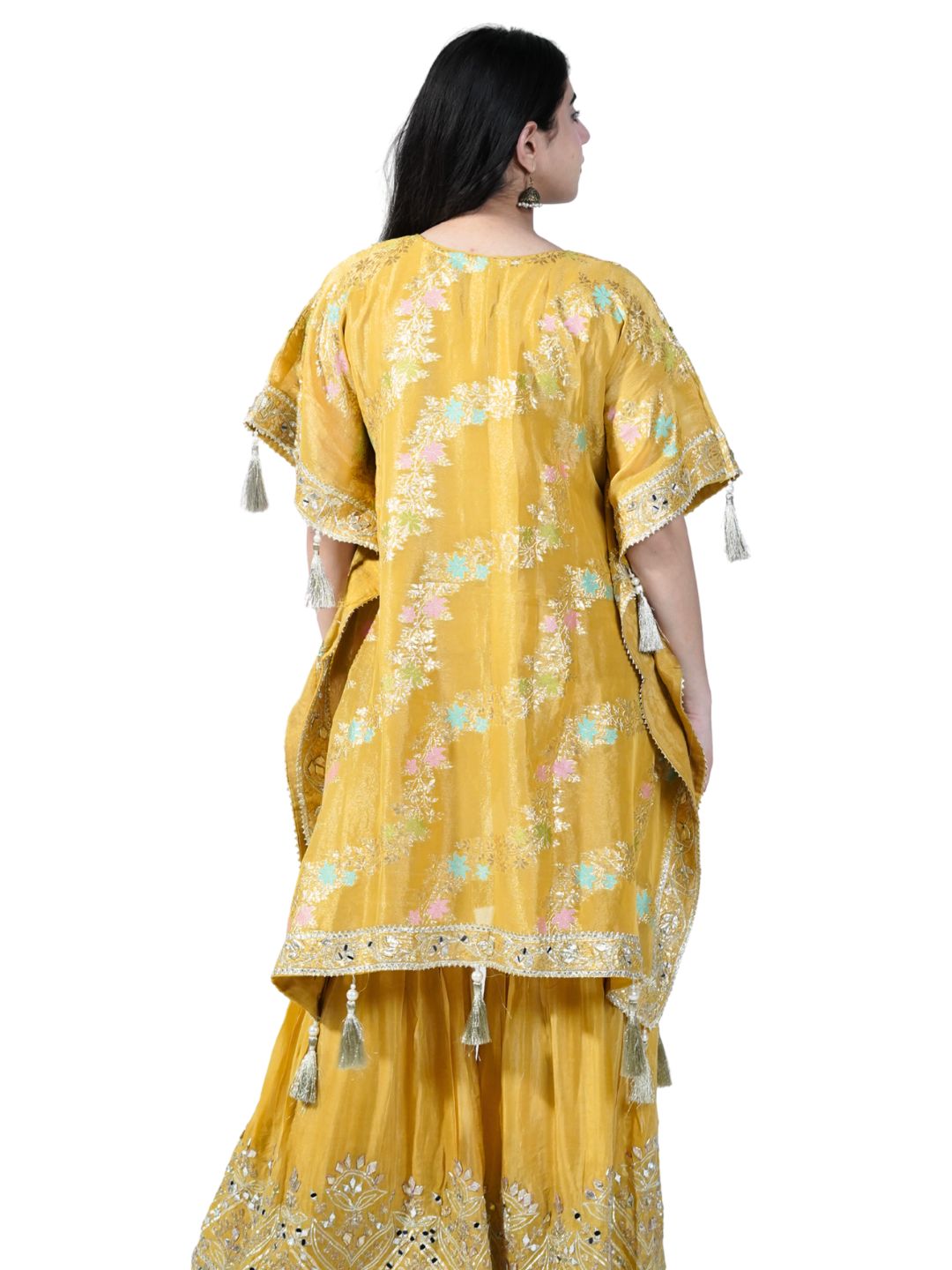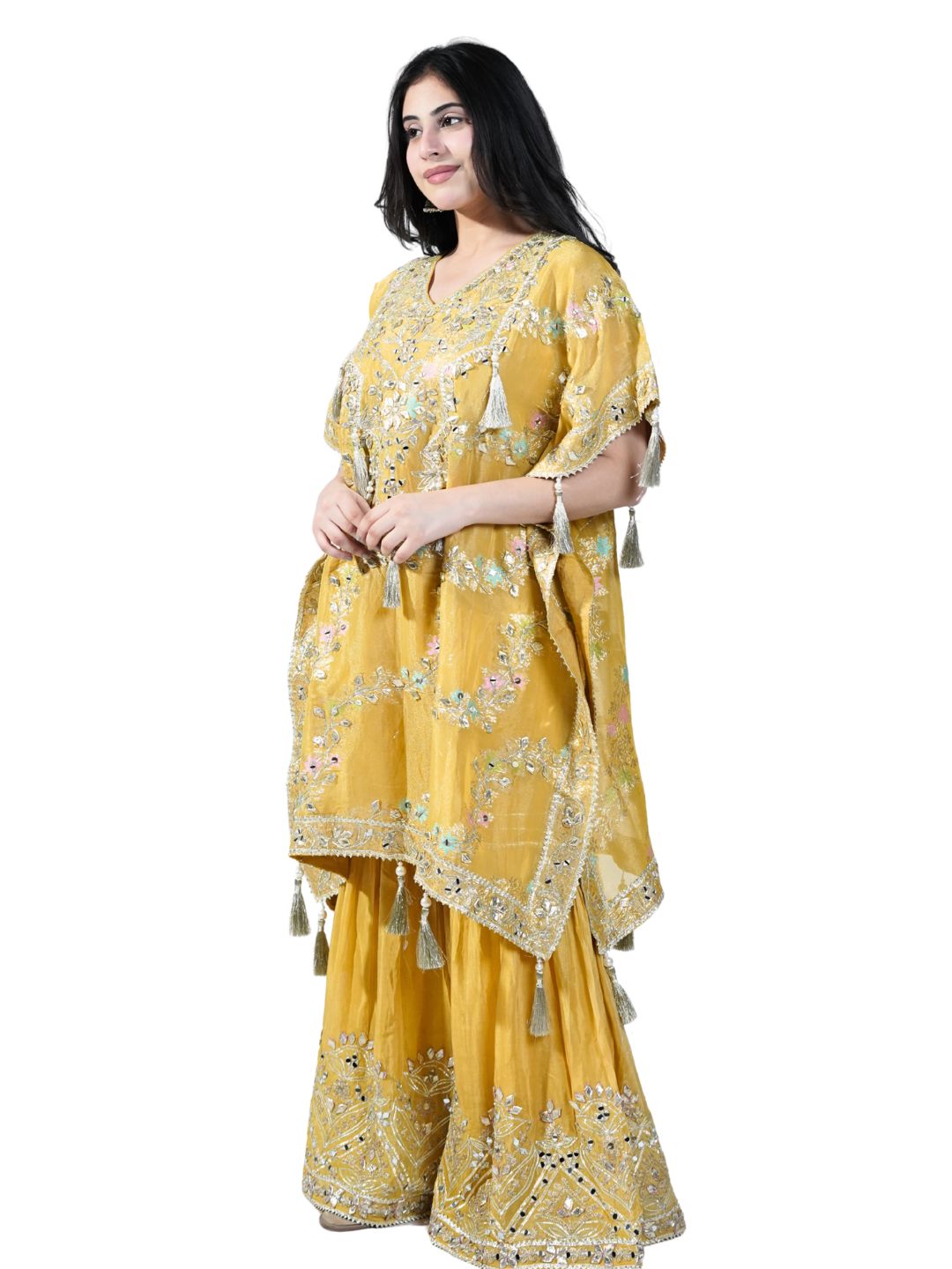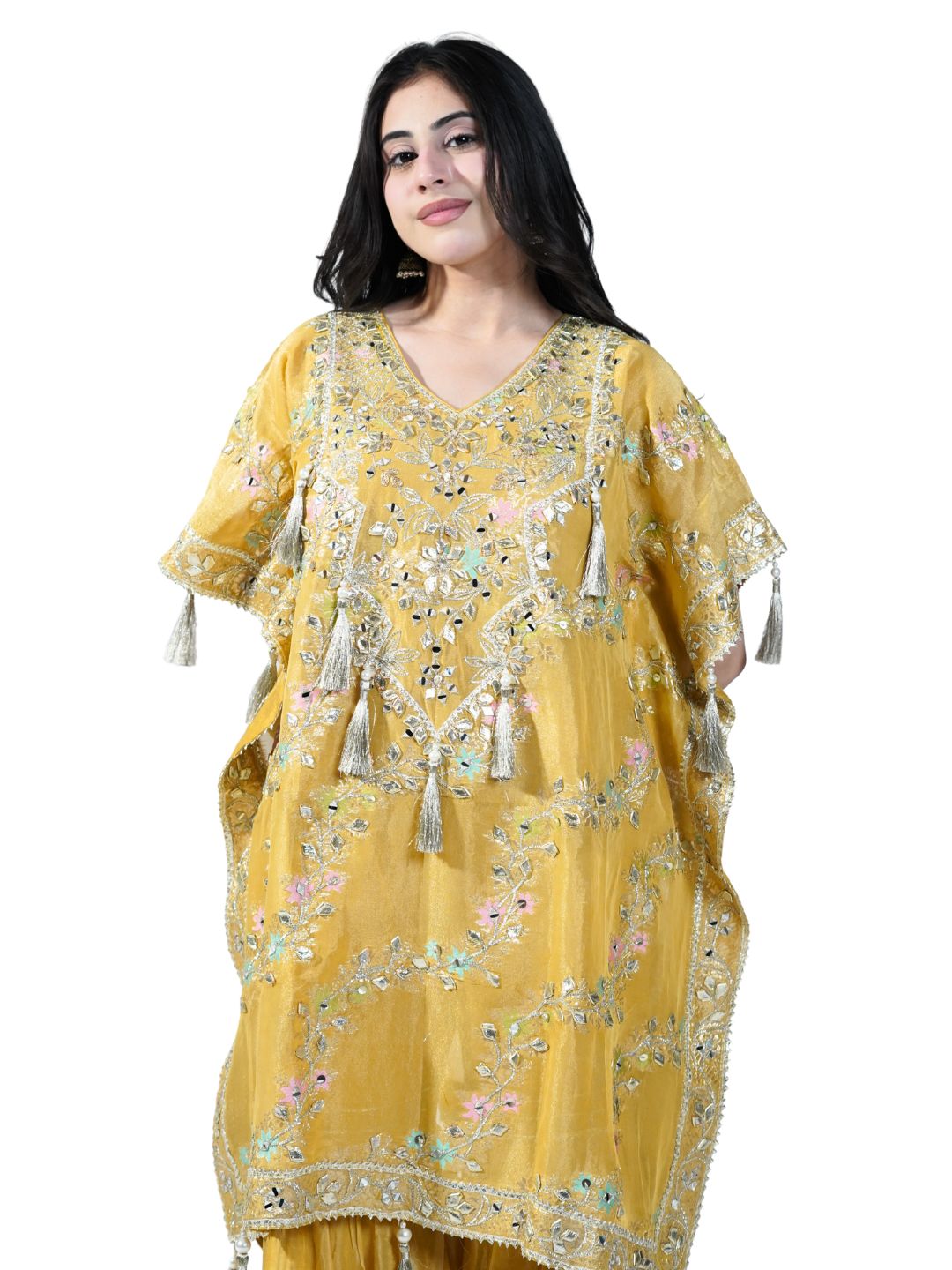 Fabric: Luxurious Banarasi fabric with intricate woven motifs Design: Relaxed-fit kaftan paired with a stylish flared garara Look: A perfect... Read more