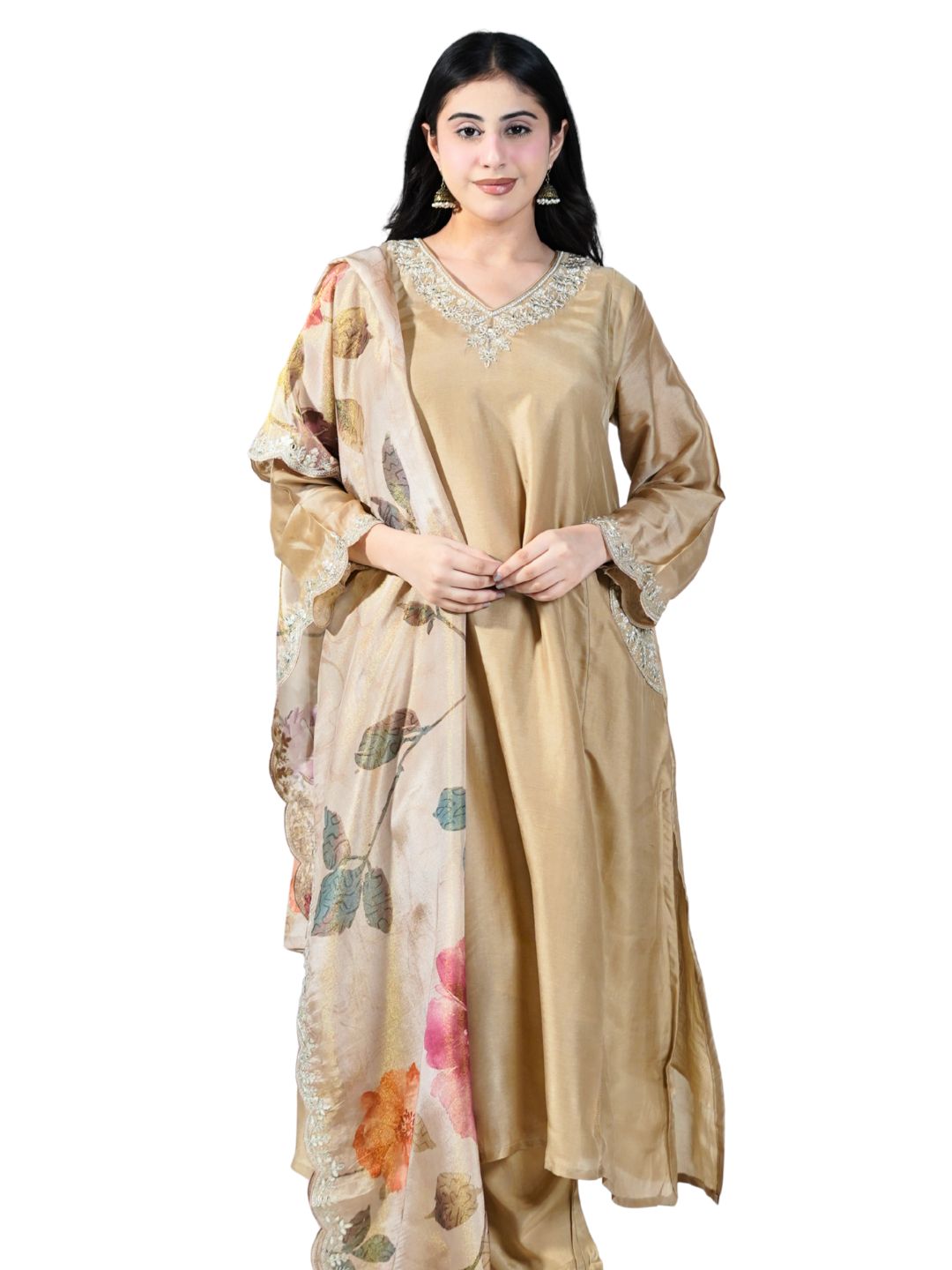 Silk Kurti Set with Neck Work & Printed Dupatta